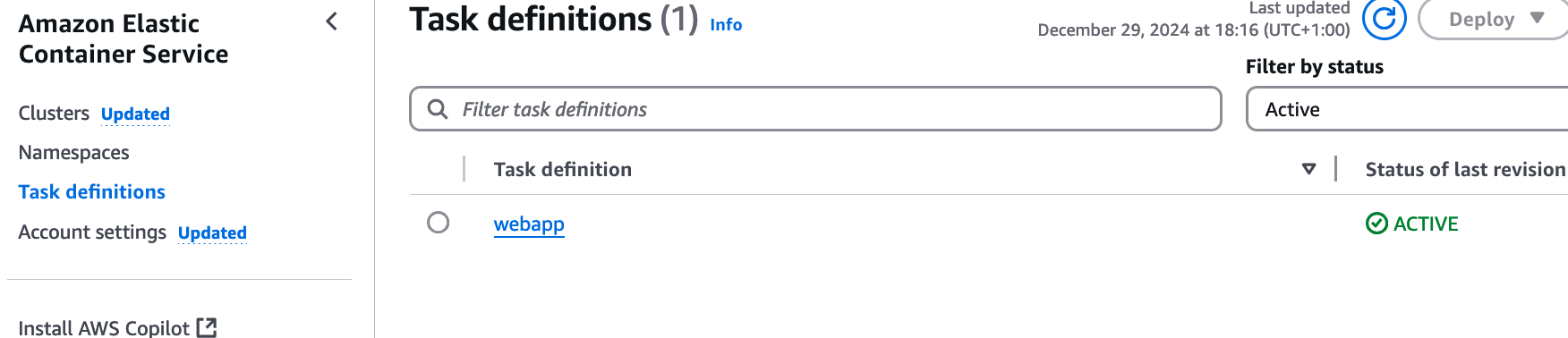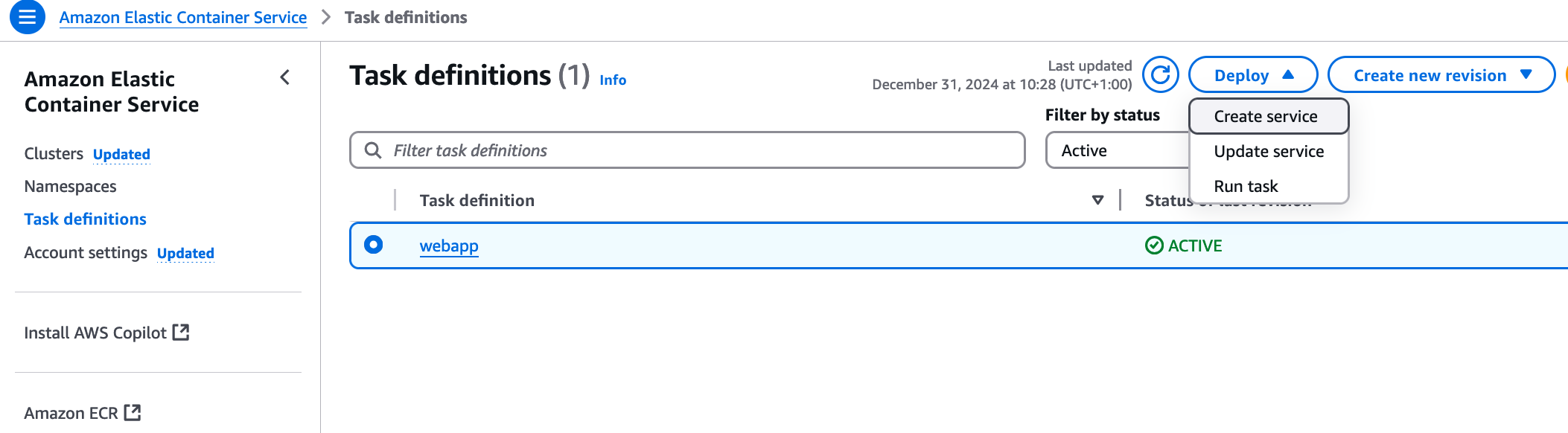 You can drill further into the task definition to see the settings in place there. What we should focus on now, though, is to get it running. At this stage, we only have the task definition, not an actual running task. We could start the webapp manually from AWS Console, by creating an ECS Service, or starta a task there.