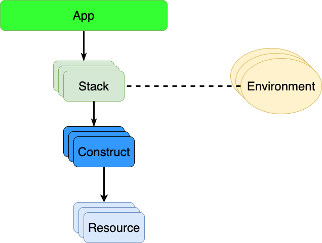 A CDK App will consist of a number of stacks, which in turn consists of one or more constructs. Each construct may encapsulate one or more resources.