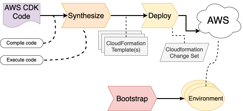 - Deploy. The process of taking the underlying CloudFormation representation that has been generated in the synthesize step to actually provision (create, update or delete) AWS resources.