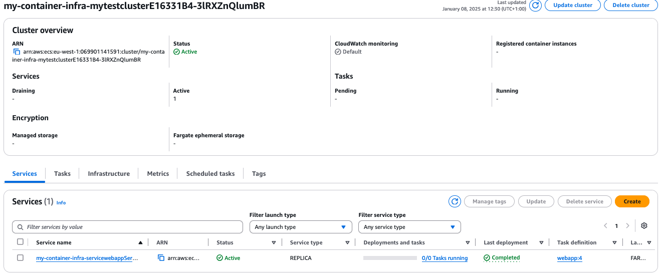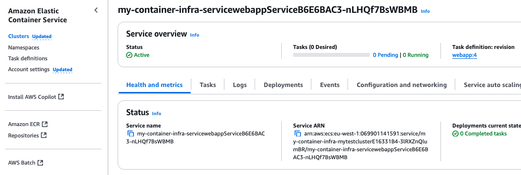 We can see that the desired count is 0, as well as the number of running tasks. This is what we expect with the deployment configuration we specified. So far, so good!