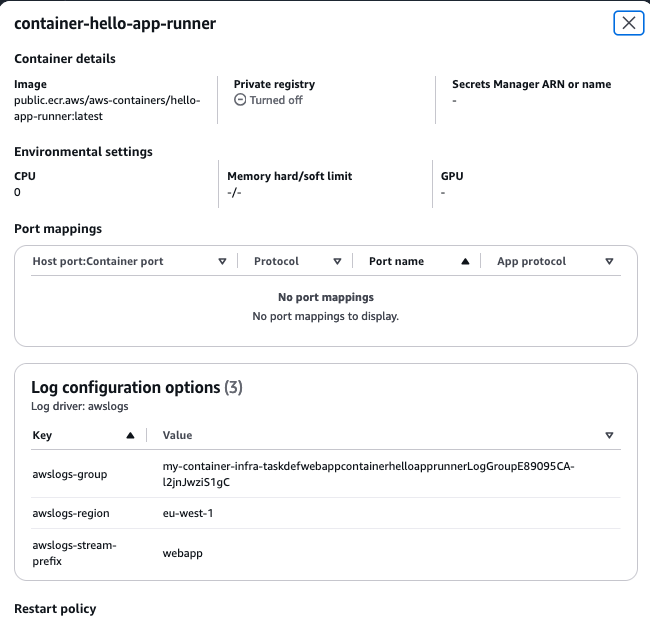 We can then also look in the Log tab, where the logs should appear. This is empty now, since we have not started anything. In the task definition, and in the details for the container, we can see the log configuration:
