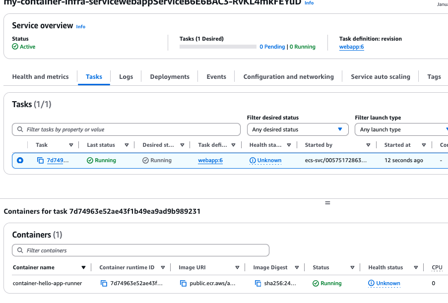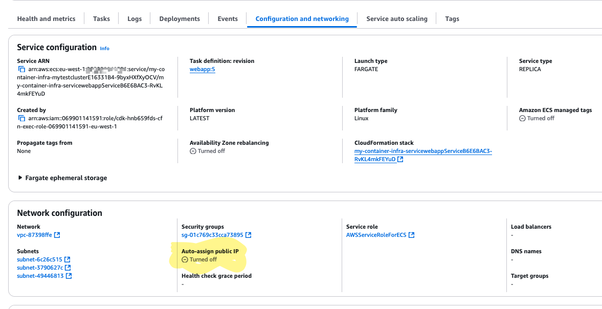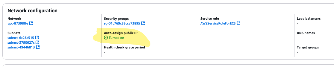 In addition, we learned that ECS performs some health checks on the tasks in the service. In this case, we had to make it reachable from the internet for the health check to work.