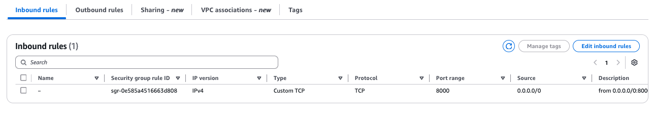 The security group looks as expected, port 8000 open for everyone. So now we have two things to update: