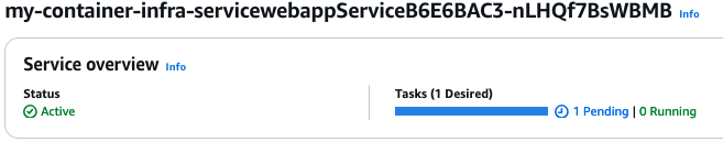 Click on the Update button at the bottom of the page. Now it will update the desired count and ECS will try to start the service. You will see that the status for the task is pending. We want it to reach status running and then we can test that we can reach the web app, just as we did with the deployment using AppRunner.
